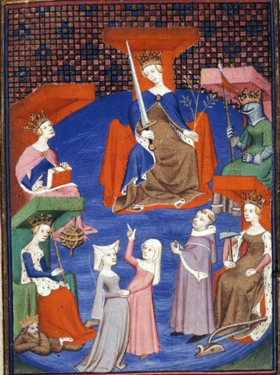 À la fin du Moyen Âge, les figures allégoriques se concrétisent de plus en plus dans des personnifications au lieu de prendre place, comme auparavant, dans des comparaisons selon A. Strubel1. Le Chemin de longue étude est un récit assez explicite de ce fait. Au début de l’ouvrage, Christine de Pizan doit composer avec la mort de son mari et rejette la faute sur la Fortune qui ne s’incarne jamais dans le texte et est seulement évoqué en temps que métaphore de la vie, de la mort et de l’injustice qui peut frapper n’importe quand et n’importe qui. Plus le récit avance cependant, plus les métaphores tendent à s’incarner, d’abord dans la scène de la fontaine de sapience, mais beaucoup plus concrètement avec le débat à la fin du récit où Richesse, Sagesse, Noblesse et Chevalerie doivent convaincre dame Raison qu’elles sont plus importantes que leurs consœurs, doivent être écoutées à meilleur titre qu’elles et leurs conseils suivis. Ce débat semble être une métaphore des conflits réelles entre plusieurs classes de la société française : nobles, chevaliers, bourgeois qui se perpétue alors en France. Ce conflit est cristallisé dans cet échange entre les dames afin, il semble, de tenter de résoudre un problème millénaire qu’est l’appât du gain. Richesse devient ainsi aux yeux de Raison «la cause de ces malheurs ; nous vous accusons tous d’inciter les hommes à sortir leurs épées, et de les pousser à leur perte parce que vous leur envoyez votre servante Convoitise […]» (p.257).