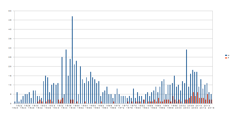 Pour remettre ça en perspective, depuis 1920, il y a une moyenne de 9,6 dhc de remis à des hommes par année et 1,1 dhc/année remis à des femmes. Bref, 10,4% de tous les dhc! Par rapport à l’année dernière, la moyenne totale des diplômes décernée aux femmes a augmenté de 0,1%! Au cours des 10 dernières années, cela monte à 11,4 pour les hommes et 3,6 pour les femmes. Il s’agit là de 24% de tous les dhc. Encore par rapport à l’année dernière, cette moyenne a augmenté pour les femmes de 0,7%.